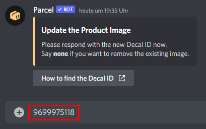 Respond to the bot with the ID we just copied from Roblox Studio. In my case, it would 9699975118.